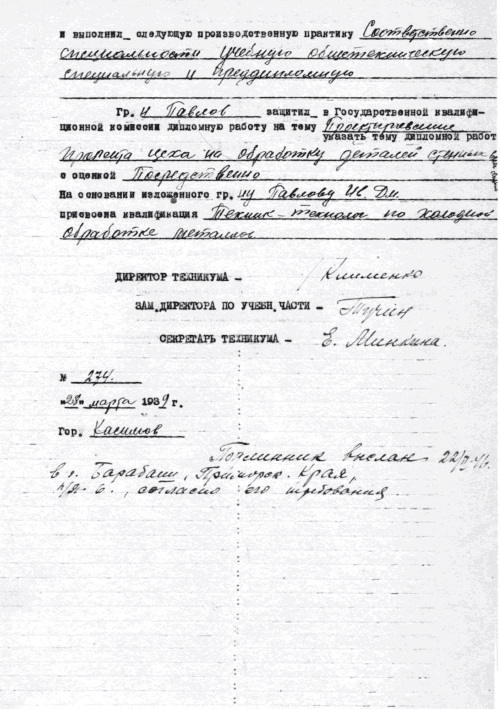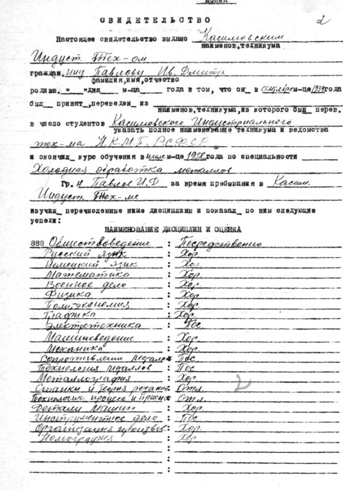 В 1934 году пятнадцатилетний Иван Павлов поступил учиться в старейшее среднее техническое учебное заведение России – Касимовский индустриальный техникум, основанный в 1896 году как семиклассное техническое училище. С начала 30-годов техникум активно развивался, так как для промышленности страны в условиях индустриализации требовалось большое количество новых технических кадров.