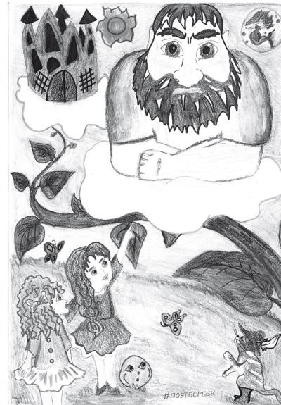 …Вдруг по каменной дорожкеПрибежал в лес Кот в сапожках,Закричал: «Беда, девчонки!Я не знаю точно сколько,Но похищены козлята!Великан в том виноватый!Он живёт над облакамиВо дворце с семью замками.Из бобов к нему растенье —Листья будто бы ступени —Прорастает в поднебесье».«Что ж, наверх теперь полезем!» —На духу решила Маша,Ведь годами Насти старше.И отправились подруги,Помогая влезть друг другуНа растение-гиганта,Ведь спасать козляток надо!Наконец, наверх залезли,Оказавшись в поднебесье,Две отважные девчонкиВ ярких ситцевых юбчонках!Влез туда и Кот в сапожках.Огляделись осторожно.Вдалеке видна не птица —Как в морской воде-водице,Грустно в облаках виталаОдинокая русалка!«Здравствуй, дева-полурыбка!Где задор твой, где улыбка?» —Общий зáдал Кот вопрос.«Мы, русалки, вешать носОт природы не привыкли!Но, поверьте, грусть настигла,Потому что великан,Седовласый грубиян,Изловил меня из моря,Чем уже довёл до горя!И теперь совсем однаЯ купаюсь в облаках…Не хочу здесь оставаться!Помогите ж оказатьсяСнова в море-океане!А с меня – злодея тайна!»Маша с Настенькой нагнулисьИ от неба отщипнулиПо кусочку белой ватыДа слепили шар громадный,Волшебством его скрепили,В нём русалку разместили.«Мои рыбки золотые,Героини молодые!Вот спасибо за ковчег!Не забуду я вас век.Расскажу секрет злодея:Он от песен молодеет.Если, девочки, удастсяВ лапы вам его не датьсяИ без пауз петь прегромко,Превратится он… в ребёнка!»Отбылá русалка в шаре,Растворилась словно в паре,До водички добраласьИ к подругам понеслась.Маша с Настей да КотомК замку двинулись пешком.У дверей огромных всталиИ стучаться долго стали.«Это кто такой бесстрашныйНарушает сон мой важный?» —Голос спрашивает громко,Глаз огромный смотрит в щёлку.«Наш бродячий дружный циркНаконец забрёл в ваш мир! —Говорит спокойно Маша. —С нас – веселье! С вас же – каша».«Не видал я раньше цирка, —Великана голос фыркнул. —Что ж, малявки, заходитеИ меня повеселите!»«Замок просто необъятный,Где ж искать теперь козляток?» —Вопрошает Кот тревожно.«Провести разведку можно! —Отвечает тут же Настя,Извлекая трубки частиИз секретного кармана. —Это дудка Шамахана!Ты ходи по замку, Кот,Если дудка запоёт,Значит, тех, кого искали,Дудка в двух шагах застала».Кот ушёл. А две девчонкиВ ярких ситцевых юбчонкахПобрели в зал великана.Чтобы выглядеть забавно,Из своих волшебных сумокИзвлекли на свет костюмы:Маша стала балеринойС пачкой пышной, как перина;Настя приоделась ведьмой:Нос крючком, а руки – плети.И вошли в огромный зал,Великан где заседал.«Здравствуй, облаков хозяин!Наш дуэт необычаен:Ведьма фокусы покажет,Балерина ладно спляшет,Укрощает пламя ведьма,Балерина ловит сетьюСтаи мыльных пузырей.Начинаем цирк скорей!»Хоть балета не знаток,Великан повержен в шок:От плие и от пуантовСердце дрогнуло гиганта!Да и ведьма хороша:Превращает не спешаЗайца в серого волчонка,А волчонка в лягушонка,Дрессирует пять метёлокИ летает, как орлёнок!Вдруг девчонки услыхалиЗвуки дудки в дальнем зале.Всполошился великан:«Это кто балует там?!Я слежу за тишинойВ этом замке день-деньской!Я совсем не музыкальный,Как злодей же, я коварный!Ух, держитесь, буду злиться:Колдовать, кричать, сердиться!»Тут подружки враз смекнули —Дружно песню затянули!Растерялся людоед,Перешёл аж на фальцет:«Пощадите! Не шумите!Песни вы свои уймите!»В