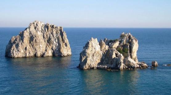 Скалы-островки стоят в некотором отдалении от берега моря напротив Артека.
