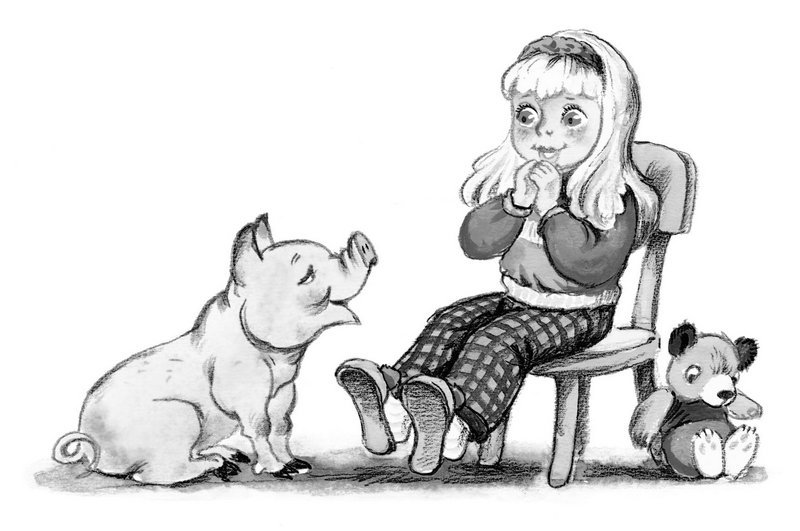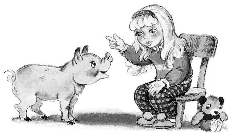 Один раз я видел, как одна совсем маленькая девочка учила поросёнка говорить. Поросёнок ей попался очень умный и послушный, но почему-то говорить по-человечески он ни за что не хотел. И девочка как ни старалась – ничего у неё не выходило.