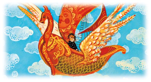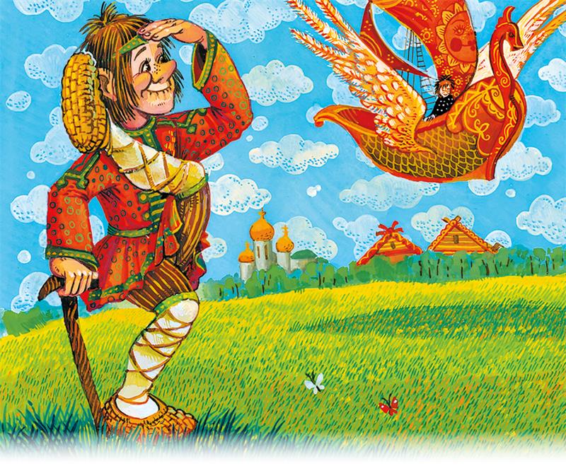 Летели-летели, глядь – несёт человек за спиною полон мех хлеба. «Здоров, дядьку! Куда идёшь?» – «Иду, – говорит, – добывать хлеба на обед». – «Да у тебя и так полон мешок за спиною». – «Что тут! Для меня этого хлеба и на один раз укусить нечего». – «Садись-ка с нами!» Объедало сел на корабль, и полетели дальше. Летели-летели, глядь – ходит человек вокруг озера. «Здоров, дядьку! Чего ищешь?» – «Пить хочется, да воды не найду». – «Да перед тобой целое озеро; что ж ты не пьёшь?» – «Эка! Этой воды на один глоток мне не станет». – «Так садись с нами!» Он сел, и опять полетели. Летели-летели, глядь – идёт человек в лес, а за плечами вязанка дров. «Здоров, дядьку! Зачем в лес дрова несёшь?» – «Да это не простые дрова». – «А какие же?» – «Да такие: коли разбросить их, так вдруг целое войско явится». – «Садись с нами!» Сел он к ним, и полетели дальше. Летели-летели, глядь – человек несёт куль соломы. «Здоров, дядьку! Куда несёшь солому?» – «В село». – «Разве в селе-то мало соломы?» – «Да это такая солома, что как ни будь жарко лето, а коли разбросаешь её – так зараз холодно сделается: снег да мороз!» – «Садись и ты с нами!» – «Пожалуй!» Это была последняя встреча; скоро прилетели они до царского двора.