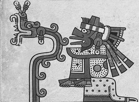 пернатый змей слева и бог ветра Эхекатль справа Кодекс Лауда, XVI в.