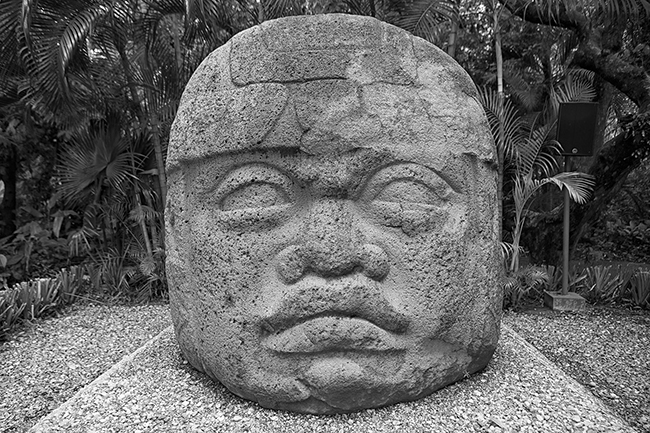 Цивилизация ольмеков оставила нам находки в виде топоров с изображением ягуаров, очень реалистичные скульптуры, нефритовые маски и огромные каменные мужские головы, навевающие ассоциации с идолами острова Пасхи, но совершенно другие по форме. Материал для их изготовления доставлялся издалека, головы за время своего существования переставлялись с места на место, и из-за этого возраст обнаруженных мегалитов трудно датировать. Поскольку головы не похожи одна на другую, существует теория, что это портреты правителей, военачальников или, возможно, игроков в мяч. На сегодняшний день их обнаружено семнадцать штук. Наука пока не знает, с помощью каких ухищрений ольмекам удавалось передвигать огромные базальтовые глыбы, не имея тяглового скота и не зная колеса. Как им удавалось справляться с гравитацией и трением?