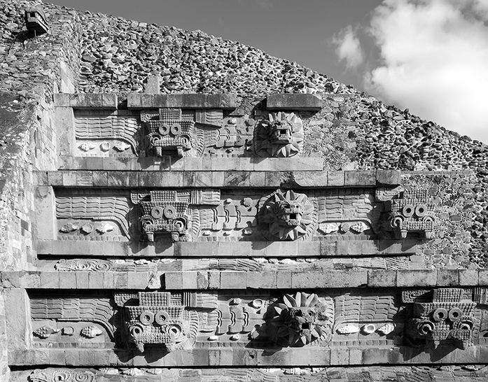 Дорога начиналась от храма Кецалькоатля – архитектурного комплекса, состоявшего из 16 зданий. Стоящий на вершине пирамиды храм практически не сохранился, но мы можем судить о нем по уцелевшему фасаду «шестиэтажной» пирамиды, украшенному скульптурами 365 оперенных змеиных голов и бабочек. Во время проведенных в храме раскопок археологам удалось обнаружить секретное хранилище даров, пожертвованных жителями города при его закладке, где вперемешку лежали большие морские раковины, человеческие зубы, украшения из нефрита, обсидиановые кинжалы и другие артефакты тех времен.