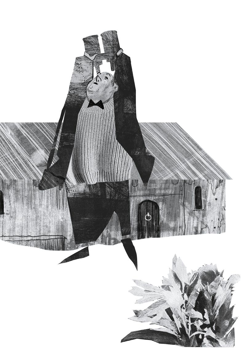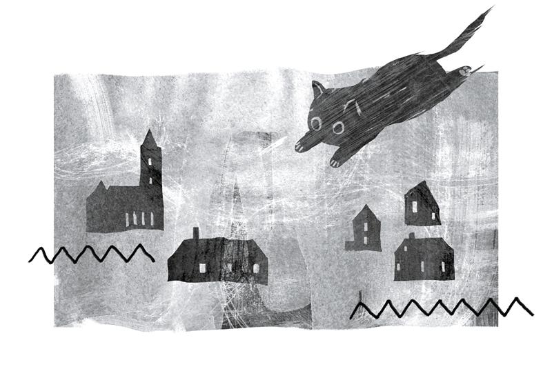 Какая‐то черная форма, не квадрат и не прямоугольник, но знакомый контур (может быть, это бывший сарай?), летит над Рони, взмахивая краями. И Рони, заметив ее боковым зрением, вдруг вскакивает на своей крыше, подпрыгивает и гребет руками. Рони хватает форму за самый угол и на лету сворачивает ее в трубу. Потом рвет ее на две части, соединяет их вместе и подносит к лицу.