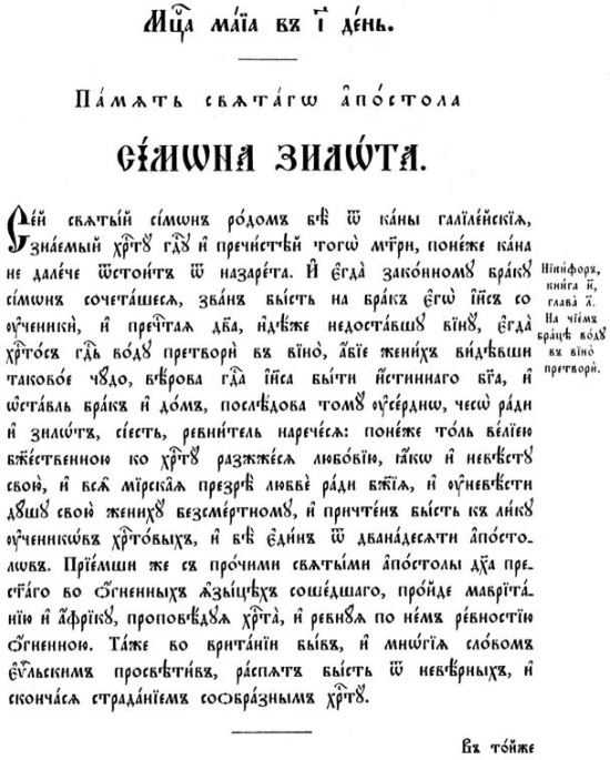 Сей святой Симон происходил из Каны галилейской и был лично известен Господу и Его Пречистой Матери, так как город Кана отстоял на небольшом расстоянии от Назарета. Когда Симон справлял торжество по случаю своего вступления в брак, то на это торжество он пригласил и Господа, с Его учениками, и Пречистую Матерь[3]. Но так как для гостей недостало вина, то Господь претворил воду в вино (см.: Ин. 2, 1—11). Будучи поражен таким чудом, жених уверовал в Господа Иисуса Христа, как Бога истинного и, оставив брачное торжество и тот самый дом, последовал с усердием за Господом Иисусом; поэтому он и был прозван Зилотом, или ревнителем[4], так как разжегся столь великою ревностью, что оставил ради любви к Христу и свою невесту, и все свои привязанности, уневестив душу свою Жениху Небесному. За это Симон был причтен к сонму учеников Христовых и к лику святых двенадцати апостолов.