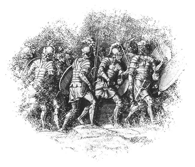 Но не одной торговлей, ремеслами и земледелием занимались и интересовались этруски. Вот по улицам города, сверкая своими доспехами в ярких лучах солнца, проходит отряд воинов. Они в шлемах с перьями, вооружены длинными копьями, мечами и круглыми большими щитами. Во главе отряда едет верхом предводитель в богатых золоченых доспехах. Это один из видных аристократов с своим отрядом возвращается из набега на соседнее племя. Этрусская знатная молодежь охотно участвует в подобных набегах, набирая из своих крестьян отряды воинов. Эти удалые набеги захватывают их больше, чем охота, верховая езда, кулачные бои и гимнастика мирного времени. Долго живет в народе, после набегов и войн, слава подвигов предводителей; долго повторяют имена героев – Макстрны, Кайлэ Випены, Аулэ Випены и других.