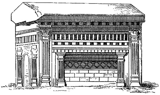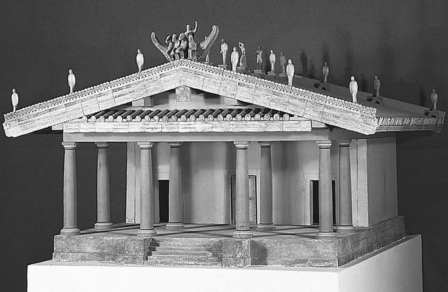В Этрурии во времена ее высшего расцвета, в VII и VI веках, было много богатых и могущественных городов. Города эти были почти все построены на вершинах гор или холмов. Высокие стены, сложенные из громадных, правильно обтесанных каменных глыб, окружали эти города и делали их неприступными крепостями. В город вели ворота с искусно сделанной аркой, строить которую этруски научились еще на Востоке. Улицы города были, правда, узки и тесны, но зато правильно расположены и вымощены каменными плитами. В городах были устроены даже стоки для воды и для нечистот. Посередине города на искусственно сделанном возвышении, облицованном камнем, возвышались храмы богов. Фасады храмов, обращенные на юг, поддерживались четырьмя колоннами, за ними находилось как бы преддверие храма с двумя колоннами, за преддверием был вход во внутреннее четырехугольное помещение, в котором и находились изображения богов. Двухскатная кровля храма была крыта черепицей. На фронтоне находились скульптурные изображения богов и героев, сделанные из глины.