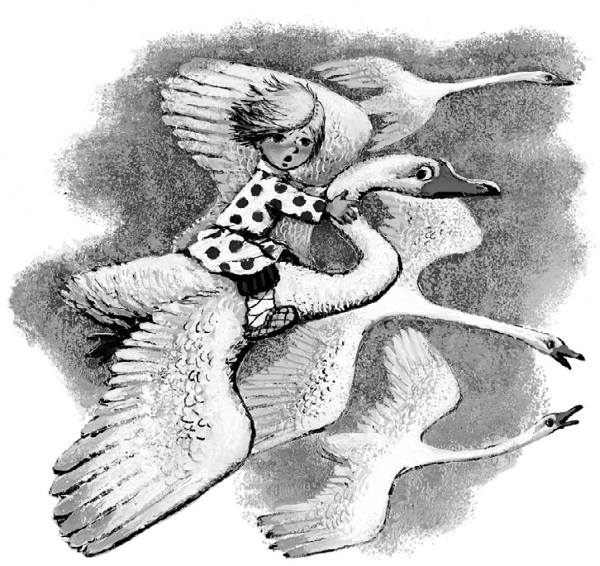 Налетели гуси-лебеди, подхватили мальчика, унесли на крыльях.