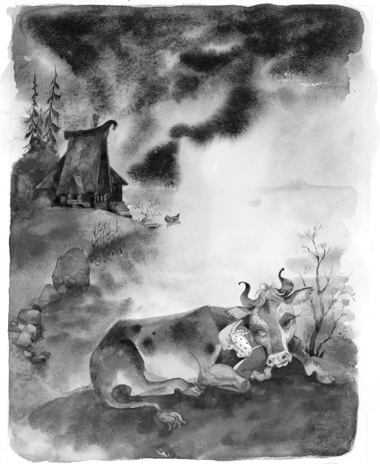 Выйдет, бывало, Крошечка-Хаврошечка в поле, обнимет свою рябую коровку, ляжет к ней на шейку и рассказывает, как ей тяжко жить-поживать: