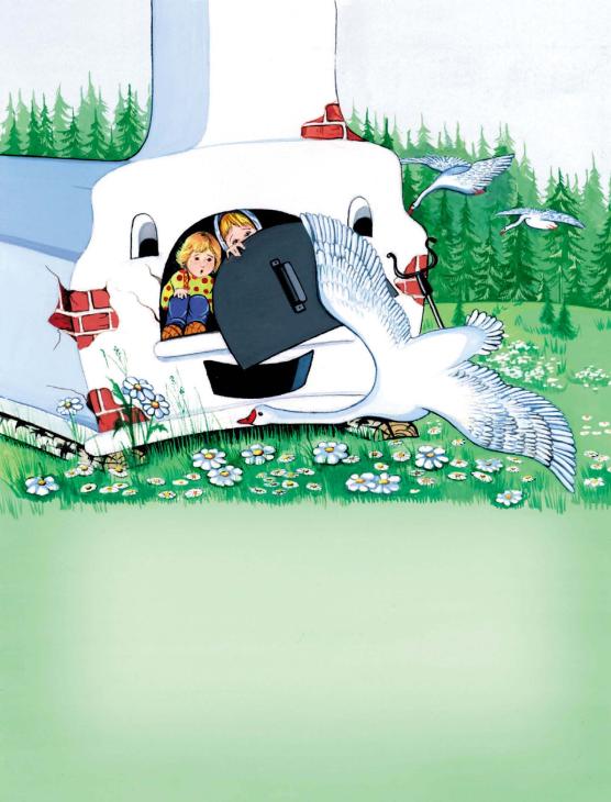 Гуси опять девочку увидали и погнались за нею. Налетают, крыльями по лицу бьют, того и гляди братца из рук вырвут. Да изба-то была уже близко.