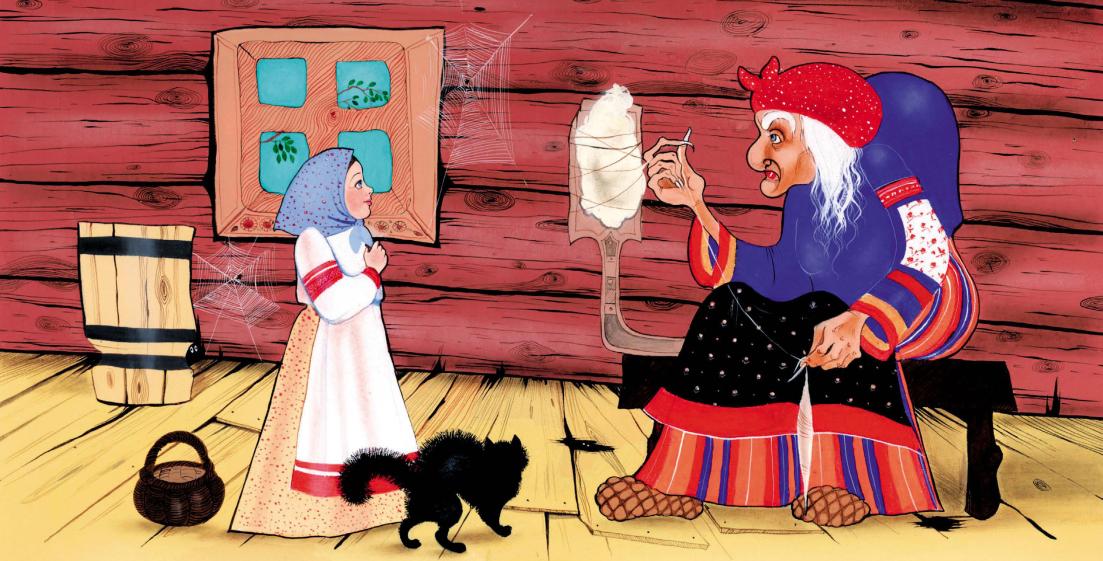 Перекрестил отец дочку и уехал. А Баба Яга велела Маше печку истопить, еду приготовить, в горнице прибраться и пряжи напрясть. Сама же к Змею Горынычу в гости в ступе полетела.