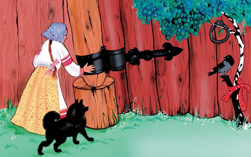 Собака хотела её рвать – она дала ей хлебца; ворота хотели перед ней захлопнуться – она полила им петли маслицем, и они её пропустили; берёзка хотела ей глаза выстегать – она перевязала ей веточки цветной лентой, и та её пропустила.
