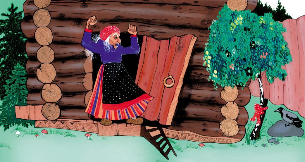Затрещали деревья, захрустели листья. Это едет Баба Яга, посвистывает, покрикивает, пестом ступу погоняет, помелом след заметает. Вылезла из ступы – и в избушку.