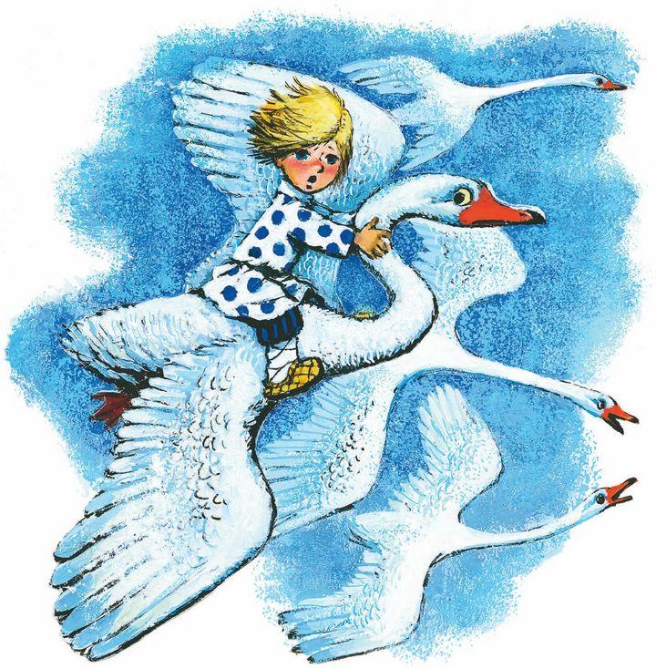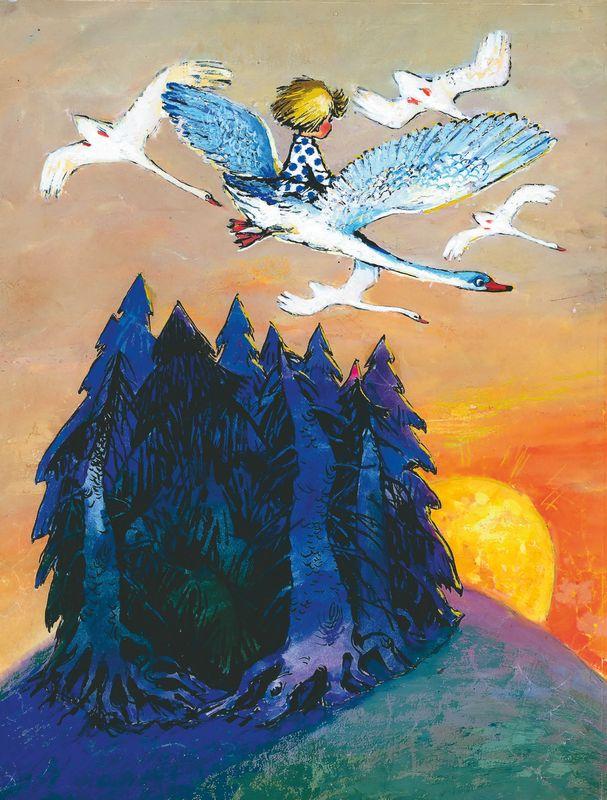 Манечка слушала их, головой кивала, а как ушли – посадила брата на травку у дома и убежала играть. Лишь остался Ванечка один – прилетели гуси-лебеди, подхватили его на крылья и улетели к лесу.