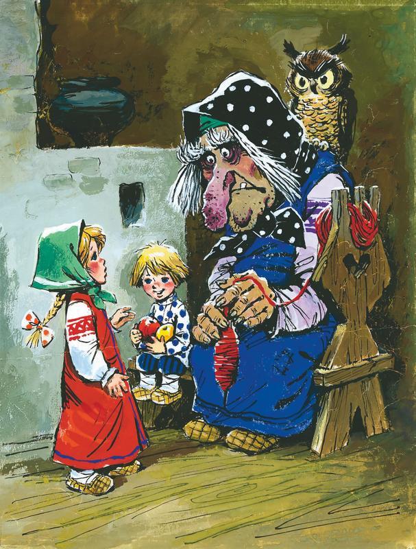 Увидел её и Ванечка. Манечка скорее приложила палец к губам, приказывая, чтобы он молчал, не выдал её. Рядом с ним сидит Баба-яга, дремлет с прялкой в руках. А на плече у неё сова сидит – не спит, смотрит.