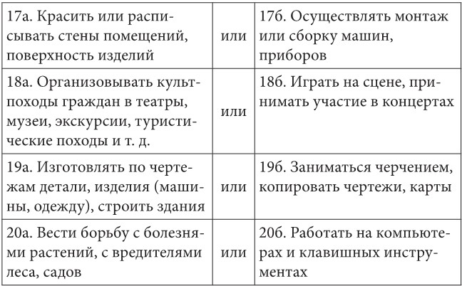 Очередной тест поможет среди общих направлений выявить конкретную специальность. Его я впервые применил к себе 15 лет назад. А перед тем как порекомендовать его вам, недавно вновь протестировался сам. Как ни странно, несмотря на то, что я стал несколько старше, показатели не изменились. Этому тесту уже более полувека, но его точность не снизилась ни на гран. Называется он «Карта интересов». Используется в целях профориентации и при приёме на работу. Может применяться для обследования как подростков, так и взрослых. Хорошие результаты получаются при использовании данной методики и с теми, кто меняет профессию. Рекомендованное время – 40–50 минут. И вы, перед тем как дать ответ, подумайте. Если вы уверены, что вам очень нравится предмет вопроса, то в ответе поставьте два плюса. Если просто нравится – один плюс. Если вопрос неинтересный – ноль. Если не нравится – один минус. Если категорически не нравится – два минуса. Отвечайте на все, не пропуская ни одного вопроса. Итак: тест № 2 «ЛЮБИТЕ ЛИ ВЫ, ХОТЕЛИ БЫ ВЫ, НРАВИТСЯ ЛИ ВАМ?»