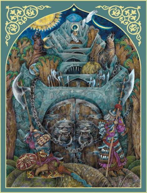 Поклонился джигит доброй старушке и поскакал. И день скакал, и ночь скакал. Доскакал до высокого забора, встречает его стража – вся в лохмотьях, собака на сено лает, а бык кость бодает. Джигит стражникам одежду дал, собаке кость положил, быку – сено, и открылись перед ним все ворота и двери. Вбежал джигит в темницу, взял за руки девицу, а как глянул на неё, чуть рассудка не лишился – такая была красавица. Но тут же он опомнился, взял красавицу на руки, выбежал за ворота, вскочил на коня и ускакал вместе с девушкой.