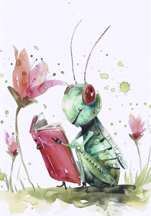 А кузнечик сидел на травке в тени цветка и увлечённо читал книгу. Заметив муравья, он поднял очки на лоб и отложил её.