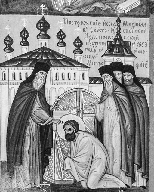 Пострижение в монашество Михаила с именем Митрофан. Клеймо иконы 2007 года. Космин монастырь