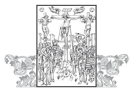 Икос 1А́нгелов ли́цы, я́ко Бо́жии служи́телие, Крест обстоя́ще, во́льную страсть Христа́ Жизнода́вца прославля́ют. Мы же страда́ньми Того́ ве́чныя сме́рти изба́вльшеся, подража́я го́рним си́лам, ра́достно взыва́ем: Ра́дуйся, Кре́сте, я́ко на тебе́ Христо́с Бог наш, во́лею ру́це распросте́р, спасе́ние на́ше соде́ла; ра́дуйся, я́ко распросте́ршимся на тебе́ Христо́м преступле́ние Ада́ма и Е́вы, просте́рших ру́це ко дре́ву запреще́нному, упраздни́ся. Ра́дуйся, я́ко воздви́жену бы́вшу на тебе́, а́ки престу́пну, Законода́вцу, дре́вняя кля́тва, я́же на нас бы́вшая, потреби́ся; ра́дуйся, я́ко соде́явшимся на тебе́, стра́нным та́инством род челове́ческий от тли сме́ртныя свободи́ся. Ра́дуйся, я́ко Пострада́вшим и У́мершим на тебе́ жа́ло сме́рти сокруши́ся; ра́дуйся, Того́ ра́ди страда́ния Бог с челове́ки примири́ся. Ра́дуйся, Честны́й Кре́сте, всера́достное зна́мение на́шего искупле́ния.