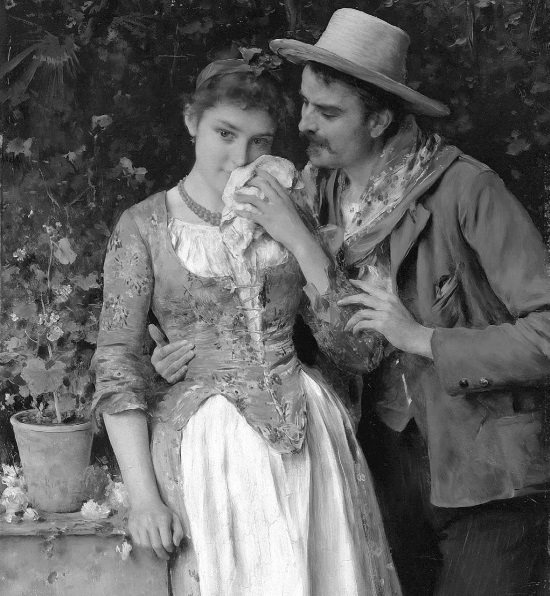 Кузнец подошел ближе, взял ее за руку; красавица и очи потупила. Еще никогда не была она так чудно хороша. Восхищенный кузнец тихо поцеловал ее, и лицо ее пуще загорелось, и она стала еще лучше».