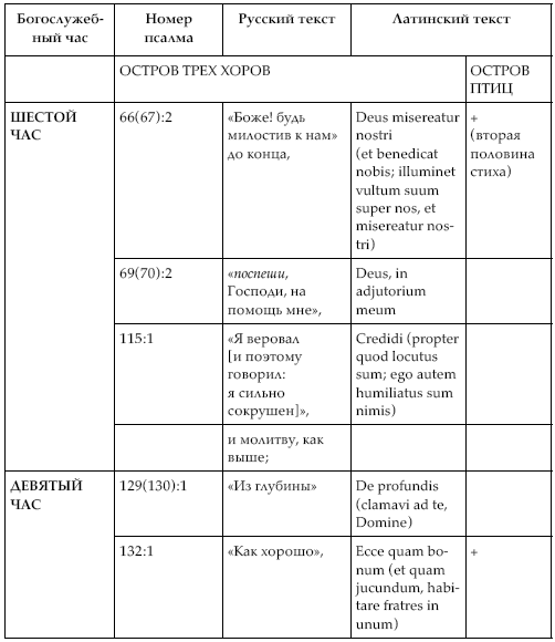Наиболее детально описывается в тексте суточный круг богослужений. Отдельные богослужебные часы упоминаются в разных главах. Наиболее подробно описано богослужение в трех случаях: это Остров птиц, Остров братии святого Альбе и Остров Трех Хоров. Начнем с комплетория (повечерия), который предположительно в то время являлся нововведением в суточном круге.