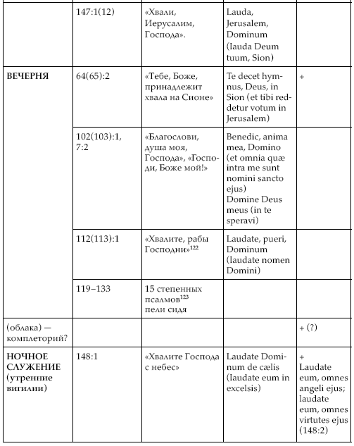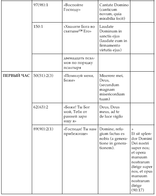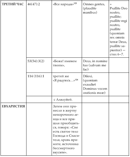В III книге своего труда Кассиан рассматривает богослужение третьего, шестого и девятого часа «по правилу монастырей Палестины или Месопотамии» (III, 1). Здесь, как отмечает Кассиан, празднование этих часов завершается ежедневно тремя псалмами (trinis psalmis cotidie finiuntur), поскольку слишком пространное богослужение мешало бы труду монахов. По словам Кассиана, в этой области (in hac regione, т. е. в Палестине, по Тафту – в Галлии [130]), в конце ночных бдений (uigiliarum), которые заканчиваются после пения петуха до рассвета, принято петь 148-й псалом и следующие за ним (т. е. 149–150). Далее говорится, что для этой «новой» службы (nouellae solemnitati) были выбраны 50, 62 и 89-й псалмы, и добавляет, что псалом 50 исполняется сейчас после завершения утрени во всех церквях Италии (что, как он считает, тоже заимствовано из Палестины, III, 6) [131].