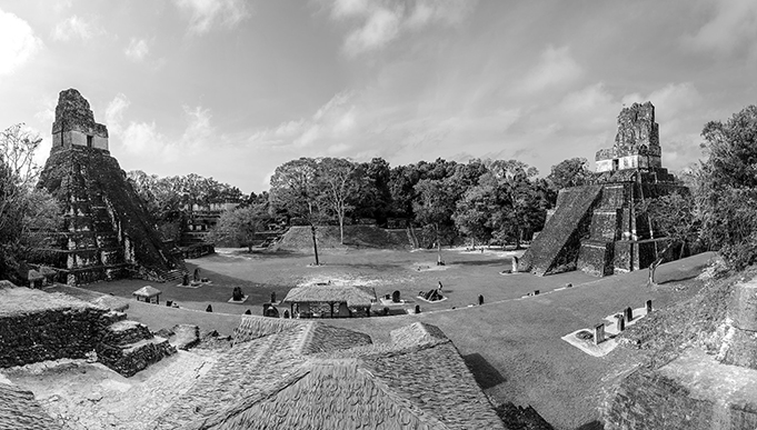 Прямоугольную Центральную площадь города украшают две стоящие друг против друга пирамиды. Девятиступенчатый Храм I, или храм Великого Ягуара, высотой 44 м служит усыпальницей одному из правителей Тикаля – легендарному Хасав Чан Кавилю по прозвищу Ах Какао. В Храме II, или храме Масок, который на 6 м ниже своего визави, покоится супруга Ах Какао. Примечательно, что в обоих случаях сначала создавались гробницы, а уже затем вокруг них возводились пирамиды и храмы. Этот прием потом будет использоваться довольно часто и не только майя.