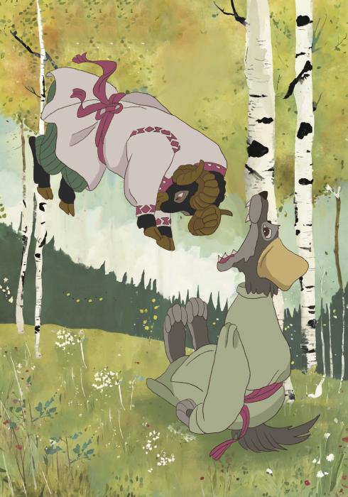 Стал он в ложбинке, открыл рот и ждёт. А баран взбежал на горку, разогнался и трах рогами волка по голове. Так искры из глаз у серого и посыпались, весь свет перед ним закружился!