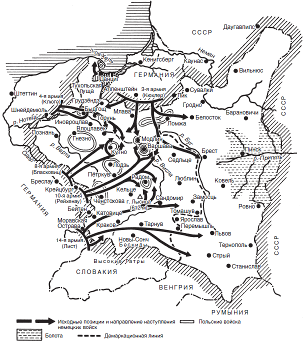Рано утром 1 сентября 1939 года главные силы германского вермахта перешли в наступление с находящихся вблизи польских границ исходных позиций. В 52 дивизии (по другим данным, 54 дивизии: Мюллер-Гилмбранд. Сухопутная армия Германии 1933–1945 гг. Т. II. С. 14, 20) вошли все без исключения имеющиеся танковые, легкие и моторизованные дивизии (среди пехотных дивизий 13 – второго и третьего оперативных эшелонов) и кавалерийская бригада. Они были сгруппированы следующим образом: