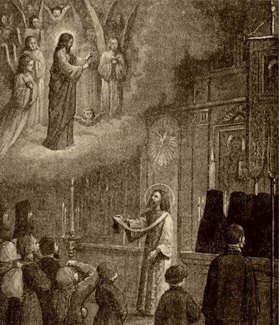 В том же 1786 г.,[5] в октябре, монах Серафим по ходатайству строителя Пахомия, посвящен был преосвященным Виктором, епископом Владимирским и Муромским, в сан иеродиакона. Ставленная грамота его на сей сан доныне цела между бумагами монастыря. Теперь кроме подвигов иночествования о. Серафиму прибавились новые труды по званию иеродиакона. Но и сердце его теперь возгорелось вящшею любовью к Богу. Он вполне предался новому своему, поистине уже ангельскому, служению. Со дня возведения в сан иеродиакона, он, храня чистоту души и тела, в течении шести лет и десяти месяцев почти беспрерывно находился в служении по обязанности иеродиакона. Ночи на воскресные и праздничные дни проводил все в бодрствовании и молитве, неподвижно стоя до самой литургии. По окончании же каждой Божественной службы, оставаясь еще надолго в храме он по обязанности священнодиакона приводил в порядок священную утварь и заботился о чистоте алтаря Господня. Господь Бог, видя благую ревность и усердие к подвигам, даровал отцу Серафиму силу и крепость, так что он не чувствовал почти трудов, не нуждался после них в слишком продолжительном отдыхе, был крепок здоровьем, часто забывал о пище, питье, и отходя с пути подвигов для отдыха, жалел зачем человек, подобно ангелам, не может беспрерывно служить Богу. Строитель Пахомий теперь еще более прежнего привязался сердцем к о. Серафиму. Без него старец не совершал почти ни одной службы: «когда батюшка Пахомий служил, – сказывал впоследствии сам о. Серафим, – то без меня, убогого Серафима, редко совершал службу».