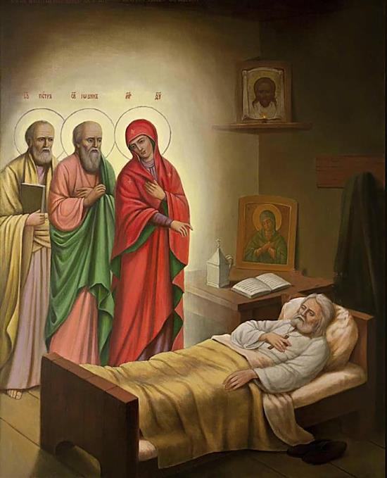 И как пеклися! В 1780 году послушник Прохор тяжко разболелся. Он слег на жесткое ложе: тело его распухло; больной лежал неподвижно. Неизвестно какая была у него болезнь; врача при нем не было: некому было определить вида болезни. По внешнему признаку думали, что Прохор страдал водяной болезнью. Но никакому сомнению не подлежит то, что был недуг упорный и продолжительный, длившийся в течение трех лет, половину коих страдалец провел в постели. Больной всецело предал свое тело и душу Богу, молился, омывал слезами ложе свое; слово ропота никогда не сходило с уст его. Тут-то открылось как все и прежде других начальствующие в монастыре, уважали, любили и жалели Прохора. Во время болезни Прохору служил, как послушник, старец о. Иосиф, его наставник и руководитель в приготовительных иноческих трудах. Строитель Пахомий, старец о. Исаия, также много пеклись о нем. Спустя много лет после сего (25 мая 1832 г.) в беседе с одной особой о. Серафим с чувством глубокой благодарности вспоминал об этой заботливости старца Пахомия. «У меня, – говорил он, – в тот раз был друг здесь в обители иеромонах Пахомий. Когда я был болен, полтора года лежал в постели, он ходил за мной, почти неотлучно находился при мне». После мы увидим как о. Серафим на деле выразил благодарные чувства к старцу Пахомию. В настоящий же раз не забудем, что Пахомий был настоятелем обители, а Прохор – послушник… и к нему-то ради недугов относились с таким усердием и заботой и строитель, и следующие после него старцы. Это обстоятельство обнаруживало в старших братиях обители высокую степень внимательности и попечения о младших, – как и должно быть во всяком благоустроенном, особенно церковном обществе. В последнем развитии недуга стали опасаться за жизнь больного. Тогда о. строитель с решительностью предлагал ему пригласить врача или по крайней мере открыть кровь. Весьма замечателен аскетический ответ больного: «я предал себя, отче святый, истинному врачу душ и телес, Господу нашему Иисусу Христу и Пречистой Его Матери; если же любовь ваша рассудит, снабдите меня убогого, Господа ради, небесным врачевством (те. причастием св. Таин)». Старец Иосиф по просьбе его и собственному усердию особо отслужил о здравии больного всенощное бдение и литургию. К богослужению собрались братия из усердия помолиться о страждущем; Прохор был исповедан и причастился св. Христовых Таин, которые были принесены в его келью, к одру его. Незадолго до кончины свой о. Серафим, всегда говоривший истину и ненавидевший ложь, многим особам рассказывал, что в этот раз по причащении святых Таин ему явилась в несказанном свете Пресвятая Дева Мария с апостолами Иоанном Богословом и Петром, и обратясь к Богослову лицом, перстом же указывая на Прохора, сказала: этот нашего рода[4]