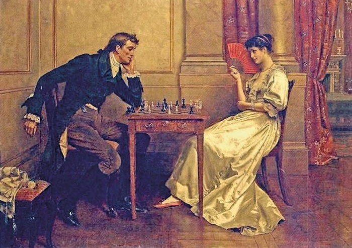 Он сонно слушал, обняв коленки и глядя на кисейный просвет меж неплотно задвинутых штор, в котором лиловатой белизной горел над улицей газовый фонарь. По потолку изредка таинственной дугой проходил легкий свет, и на письменном столе была блестящая точка – неизвестно что: блик ли в тяжелом хрустальном яйце или отражение в стекле фотографии. Он чуть было не задремал и вдруг вздрогнул оттого, что на столе зазвонил телефон, и сразу стало ясно, что блестящая точка – на телефонной вилке. Из столовой вошел буфетчик, включил на ходу свет, озаривший лишь письменный стол, приложил трубку к уху и, не заметив Лужина, опять вышел, осторожно положив трубку на кожаный бювар. Через минуту он вернулся, сопровождая господина, который, попав в круг света, схватил со стола трубку, другой рукой нащупал сзади себя спинку кресла. Слуга прикрыл за собой дверь, заглушив далекий перелив музыки. «Я слушаю», – сказал господин. Лужин из темноты смотрел на него, боясь двинуться и смущенный тем, что совершенно чужой человек так удобно расселся у отцовского стола. «Нет, я уже отыграл», – сказал он, глядя вверх и что-то трогая на столе белой беспокойной рукой. Извозчик глухо процокал по торцам. «Вероятно», – сказал господин. Лужин видел его профиль, нос из слоновой кости, блестящие черные волосы, густую бровь. «Я, собственно говоря, не знаю, почему ты мне сюда звонишь, – тихо сказал он, продолжая теребить что-то на столе. – Если только для того, чтобы проверить…» «Чудачка», – рассмеялся он и стал равномерно покачивать ногой в лакированной туфле. Потом он очень ловко подложил трубку между ухом и плечом и, изредка отвечая «да», «нет», «может быть», взял в обе руки то, что он на столе потрагивал. Это был небольшой гладкий ящик, который на днях кто-то подарил отцу. Лужин еще не успел посмотреть, что внутри, и теперь с любопытством следил за руками господина. Но тот не сразу открыл ящик. «И я тоже, – сказал он. – Много раз, много раз. Спокойной ночи, девочка». Повесив трубку, он вздохнул и открыл ящик. Однако, он так повернулся, что из-за его черного плеча Лужин ничего не видел. Он осторожно подвинулся, но на пол соскользнула подушка, и господин быстро оглянулся. «Ты что тут делаешь? – спросил он, в темном углу разглядев Лужина. – Ай-ай, как нехорошо подслушивать!» Лужин молчал. «Как тебя зовут?» – дружелюбно спросил господин. Лужин сполз с дивана и подошел. В ящике тесно лежали резные фигуры. «Отличные шахматы, – сказал господин. – Папа играет?» «Не знаю», – сказал Лужин. «А ты сам умеешь?» Лужин покачал головой. «Вот это напрасно. Надо научиться. Я в десять лет уже здорово играл. Тебе сколько?»