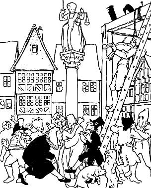 Еврей выбрался из терновника жалкий и наполовину голый. Поразмыслив, как он может отомстить, он устремился за «подмастерьем зла», прибежал, наконец, к судье и пожаловался, что он, совершенно невинный, был ограблен одним злодеем и при этом избит, и вызывая у судьи жалость, сказал: «Молодец, который сделал это, носит на спине пищаль, а на шее скрипку». Тут судья призвал сыщиков и посыльных, которые должны были поймать слугу, где бы они его не увидели. Вскоре он был схвачен и доставлен в суд. Еврей стал жаловаться на то, что слуга ограбил его, присвоил деньги, а тот сказал: «Нет, ты дал мне их, потому что я для тебя играл». Но судья быстро завершил дело и приговорил слугу к смерти через повешение. Тот стоял уже с веревкой на шее на ступеньке лестницы и вдруг сказал: «Господин судья! Не выполните ли вы мое последнее желание?». «Если ты не просишь сохранить тебе жизнь, тогда выполню!». «Нет, дело идет не о моей жизни; позвольте мне в последний раз поиграть на моей скрипке!». Тут еврей закричал: «Упаси, господи! Не разрешайте ему, не разрешайте ему!». Но суд постановил: один раз он имеет право, и посему да будет так! Они не могли ему отказать еще и потому, что он имел такой дар: в просьбе ему отказать никто не мог. Еврей же закричал: «Ради бога, свяжите меня!». Мой слуга, тем временем, взял скрипку, и только один раз провел по ней смычком, как все сразу дрогнуло и стало двигаться: судьи, писцы, охранники и никто не смог связать еврея. И он второй раз провел смычком – палач выпустил его из своих рук и тоже заплясал. Когда он заиграл вовсю, затанцевало все вокруг: впереди еврей и судейские, а за ними люди на базарной площади, пришедшие сюда из любопытства. Поначалу было очень весело, но так как игре и танцам не предвиделось конца, то они все жалобно кричали и просили его остановиться. Но он этого не сделал, пока судья не подарил ему не только жизнь, но и пообещал также оставить сто гульденов. И еще он обратился к еврею: «Негодяй, признайся, откуда у тебя деньги, иначе я не перестану играть!». «Я украл их, я украл их, а ты их честно заслужил» – громко закричал еврей, чтобы все слышали. Тут мой слуга оставил в покое свою скрипку, а негодяя повесили вместо него на виселице.