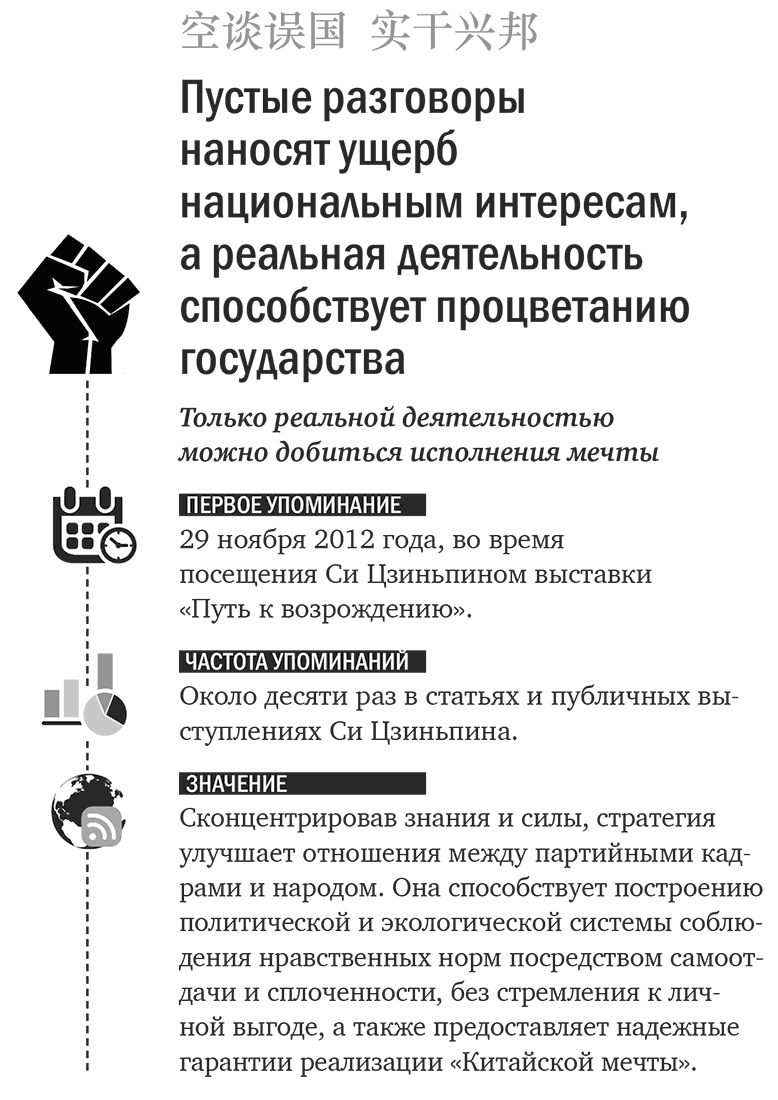 «Факты – это основа истины, реальная деятельность – единственный путь для успешного завершения дел. В этом и заключается внутренний смысл высказывания: „пустые разговоры наносят ущерб национальным интересам, а реальная деятельность способна привести к процветанию страны“», – пояснил председатель КНР Си Цзиньпин.