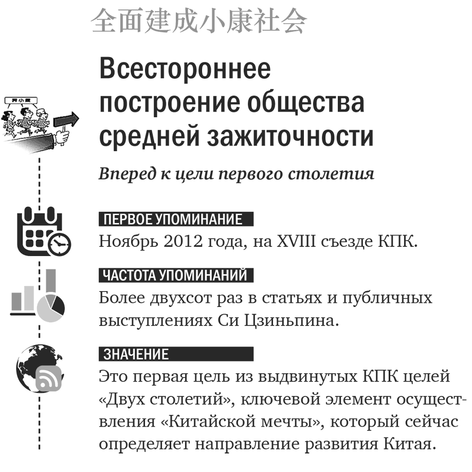 За тридцать с лишним лет политики реформ и открытости КПК проводит всестороннее развитие концепции «средней зажиточности». В 1979 году Дэн Сяопин впервые выдвинул концепцию «средней зажиточности» во время встречи с премьер-министром Японии Масаёси Охира[55]. Впоследствии, понятие «общая средняя зажиточность» сменилось на «всестороннюю среднюю зажиточность», а выдвинутая на V пленуме ЦК КПК 15-го созыва цель всестороннего построения общества средней зажиточности была заменена на декларированное на XVIII съезде завершения всестороннего построения общества средней зажиточности. Коммунистическая партия Китая постоянно углубляет значение понятия «общество средней зажиточности» и стремится к более детальному пониманию того, как его построить.