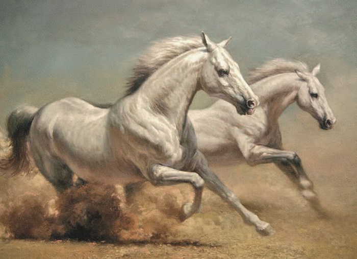 Тотчас же рядом с собою направо Изумруд услышал ревнивое, сердитое дыхание. Тут помещался Онегин, старый, норовистый бурый жеребец, изредка еще бегавший на призы в городских одиночках. Обе лошади были разделены легкой дощатой переборкой и не могли видеть друг друга, но, приложившись храпом к правому краю решетки, Изумруд ясно учуял теплый запах пережеванного сена, шедший из часто дышащих ноздрей Онегина… Так жеребцы некоторое время обнюхивали друг друга в темноте, плотно приложив уши к голове, выгнув шеи и все больше и больше сердясь. И вдруг оба разом злобно взвизгнули, закричали и забили копытами.