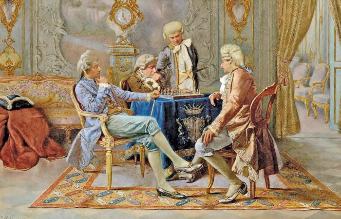 «Сперва расставим фигуры, – начала тетя со вздохом. – Здесь белые, там черные. Король и королева рядышком. Вот это – офицеры. Это – коньки. А это – пушки, по краям. Теперь…» Она вдруг замерла, держа фигуру на весу и глядя на дверь. «Постой, – сказала она беспокойно. – Я, кажется, забыла платок в столовой. Я сейчас приду». Она открыла дверь, но тотчас вернулась. «Пускай, – сказала она и опять села на свое место. – Нет, не расставляй без меня, ты напутаешь. Это называется – пешка. Теперь смотри, как они все двигаются. Конек, конечно, скачет». Лужин сидел на ковре, плечом касаясь ее колена, и глядел на ее руку в тонком платиновом браслете, которая поднимала и ставила фигуры. «Королева самая движущаяся», – сказал он с удовольствием и пальцем поправил фигуру, которая стояла не совсем посреди квадрата. «А едят они так, – говорила тетя. – Как будто, понимаешь, вытесняют. А пешки так: бочком. Когда можно взять короля, это называется шах; когда ему некуда сунуться, это – мат. Ты должен, значит, взять моего короля, а я твоего. Видишь, как это все долго объяснять. Может быть, в другой раз сыграем, а?» «Нет, сейчас», – сказал Лужин и вдруг поцеловал ее руку. «Ах ты, милый, – протянула тетя, – откуда такие нежности… Хороший ты все-таки мальчик». «Пожалуйста, будем играть», – сказал Лужин и, пройдя по ковру на коленках, стал так перед столиком. Но она вдруг поднялась с места, да так резко, что задела юбкой доску и смахнула несколько фигур. В дверях стоял его отец.