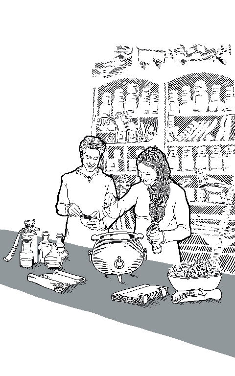 Вот так и вышло, что на экзамене и мне, и Софе пришлось работать казёнными инструментами. Нам выдали длинные неуклюжие ложки, тупые ножи модели 1875 года. Мы уныло скребли этими ложками по днищам котлов (да, котлы на экзамене были раздельные, факультет по такому случаю расщедрился на двойной набор ингредиентов). Надо было варить зелье-противоядие. И так задачка непростая, а с чужими непривычными инструментами ‒ вдвойне.