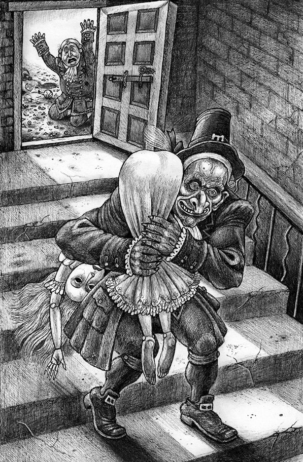 Натанаэль в смертельном ужасе отпрянул, узнав фигуру Олимпии. Он хотел уже было броситься к ним, чтобы отнять возлюбленную у этих разъяренных людей, но в эту минуту Коппола со страшной силой вырвал фигуру из рук профессора и нанес ею Спаланцани такой сокрушительный удар, что тот повалился на стол, где стояли бутыли, реторты, колбы и стеклянные цилиндры. Все эти сосуды разлетелись на тысячи осколков. Коппола перекинул женскую фигуру через плечо и с мерзким визгливым смехом побежал вниз по лестнице, задевая за ступени ее безобразно свешивающимися ногами, которые вращались и с деревянным стуком бились о ступени.