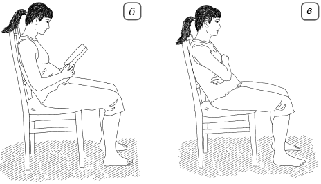 а – правильная поза в положении сидя; б, в – неправильная поза в положении сидя