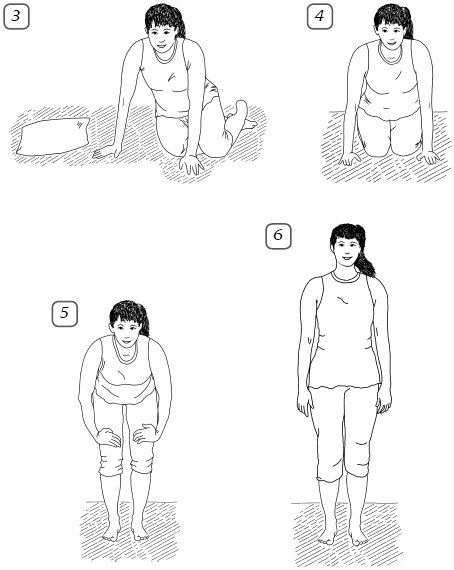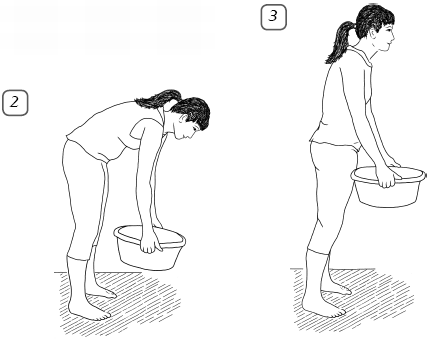 → Обопритесь руками о колени и встаньте, выпрямите спину.