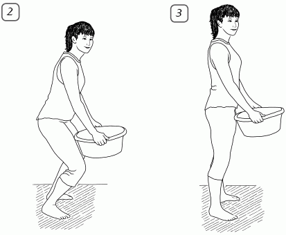Будущие мамы должны знать, что во время беременности надо беречь себя и не поднимать тяжести. Нельзя подбрасывать ничего тяжелого, класть что-либо тяжелое на полку, расположенную выше головы. Если вы несете тяжелые покупки, то постарайтесь распределить их равномерно в обе руки. Если вам нужно поднять что-то с пола или перенести с места на место, никогда не делайте так, как показано на рис. 4.