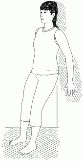 Исходное положение: стоя спиной к стене, пятки на длину стопы от стены, ноги на ширине плеч, руки вытянуты вдоль тела.