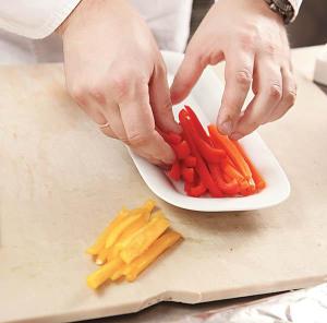Филе лосося нарезать тонкими ломтиками. Донышки артишоков разрезать на 4 части. Мини-спаржу бланшировать в кипящей подсоленной воде 2 минуты.