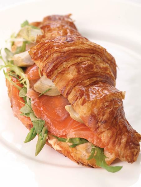 Салатные листья заправить соком лайма. Выложить попеременно на каждый круассан микс салатных листьев, ломтики копченого лосося, мини-спаржу, артишоки.