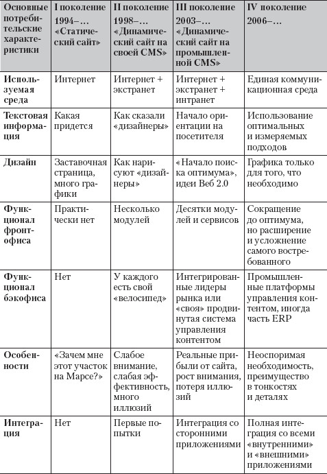 Буквально за несколько лет сфера веб-разработок прошла путь эволюции от примитивных статичных веб-страничек (текст + картинки) до многофункциональных интегрированных с другими приложениями веб-систем. Появилась реальная возможность «вынести» в веб-среду многие бизнес-процессы, сформировать механизмы распределенной работы проектных групп и т. д. Компании стали создавать не один, а множество сайтов, заточенных под решение специализированных задач (например, сайты отдельных направлений бизнеса, торговых марок, для разных групп потребителей). При возникновении критической массы пользователей сформировалась блогосфера, появились подкасты (прослушиваемые в Сети аудиоролики) и целый пучок проектов тренда Веб 2.0, основанных на генерации контента самими посетителями.