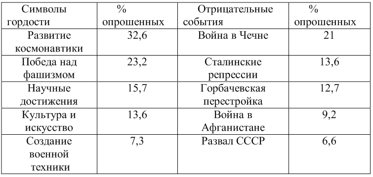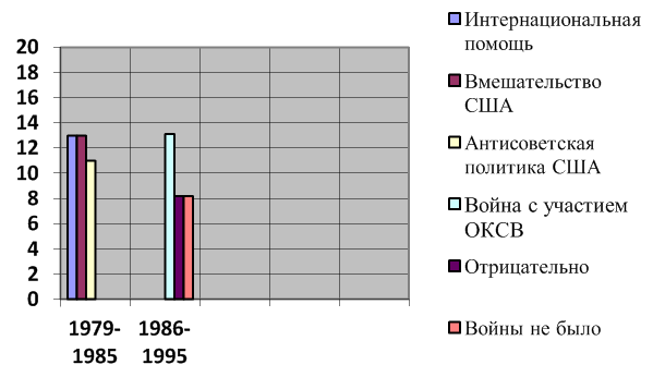 В комментарии к исследованию, данном В. Э. Бойковым, говорится о «бесславных войнах, жестоких репрессиях, социальных невзгодах…», которые вызывают «отчужденное отношение к стране и государству»10. Хотя мы не можем с точностью утверждать, какие именно эмоции и чувства испытывали респонденты, называя в числе отрицательных событий войну в Афганистане, сам факт подобного ответа и трактовки исследователя является своеобразным «маячком» исторической памяти.