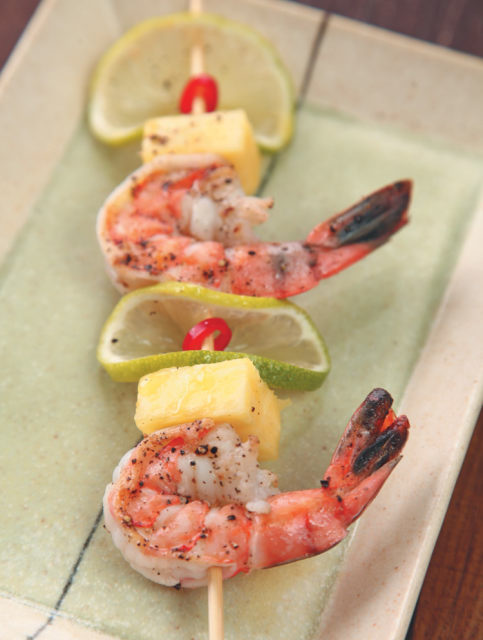 Скрепить креветки с ананасом с помощью деревянных шпажек, сверху насадить лайм и перец чили. Проделать эту операцию, пока не закончатся все ингредиенты.